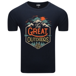 Koszulka z kolorowym nadrukiem w stylu vintage przedstawiającym górski krajobraz z napisem „The GREAT OUTDOORS” wpisanym w ozdobną ramkę, przywołuje ducha przygody i odkrywania natury. Grafika zawiera motywy gór, lasów, strzały i kompasu, a ciepła paleta barw w odcieniach pomarańczy, zieleni i błękitu na tle zachodzącego słońca dodaje jej nostalgicznego uroku.