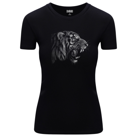 Koszulka "Tiger's Portrait" – mocny, wyrazisty nadruk przedstawiający portret tygrysa, uchwycony w chwili gniewu. Grafika realistycznie oddaje potęgę tego majestatycznego drapieżnika, z detalami w postaci jego pręgowanego futra i ostrych kłów, które nadają koszulce dzikiego charakteru. Tygrys, symbol odwagi, siły i niezależności, jest ukazany w pełnej okazałości, przyciągając wzrok i budując dynamiczny, pełen energii wizerunek.