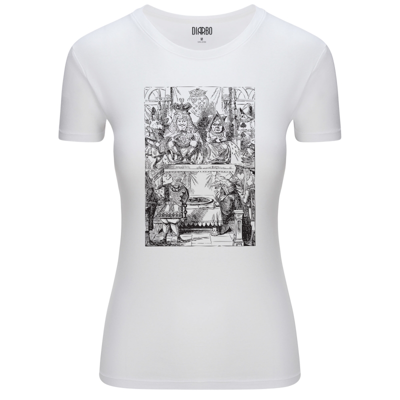 Koszulka "Alice in Wonderland - King and Queen" – elegancka ilustracja inspirowana klasyczną powieścią "Alicja w Krainie Czarów". Grafika przedstawia Króla i Królową Kier w pełnej krasie, z charakterystycznymi detalami, które pojawiają się w znanej scenie z książki. Ilustracja, stworzona przez Johna Tenniela, ukazuje dwór królewski, w którym Alicja spotyka tych wyjątkowych bohaterów, pełnych humoru i absurdów.
