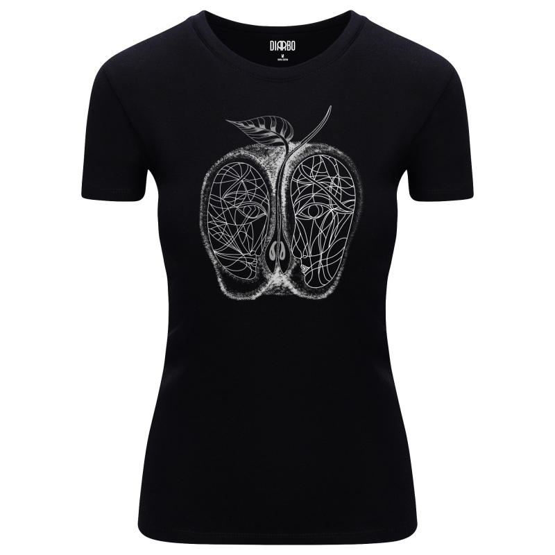 Koszulka z intrygującą grafiką przedstawiającą przekrojone jabłko, którego wnętrze wypełniają abstrakcyjne, kubistyczne twarze. Linia rysunku jest delikatna i precyzyjna, łącząc organiczne kształty z geometryczną formą. Motyw ten symbolizuje harmonię między naturą a ludzką tożsamością, oferując nieoczywisty, artystyczny przekaz dla osób ceniących oryginalność i głębsze znaczenie w modzie.