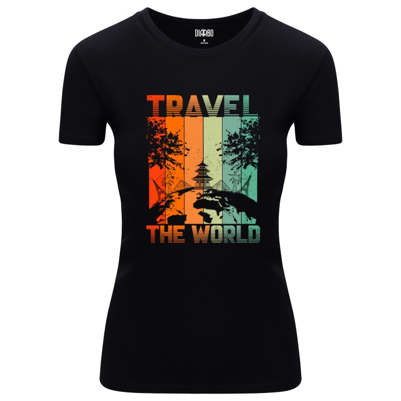 Koszulka z retro grafiką przedstawiającą azjatycką pagodę zawieszoną na moście linowym między egzotycznymi drzewami, na tle pionowych pasów w odcieniach pomarańczy, żółci, zieleni i błękitu, emanuje duchem podróży i odkrywania odległych kultur. U góry i u dołu widnieją stylizowane napisy „TRAVEL” i „THE WORLD”, podkreślające globalny charakter przygód.