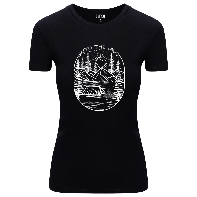Koszulka z minimalistycznym nadrukiem przedstawiającym leśny krajobraz z namiotem nad jeziorem, górami w tle i wschodzącym słońcem, emanuje spokojem i harmonią z naturą. U góry, wkomponowany w owalną ramkę, widnieje napis „INTO THE WILD”, który idealnie oddaje ducha outdoorowych przygód i ucieczki od miejskiego zgiełku. Prosta, kreskówkowa estetyka nadaje całości subtelnego i stylowego charakteru.