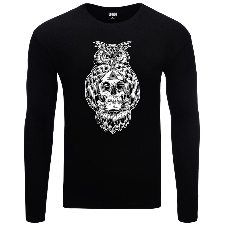 Koszulka z grafiką przedstawiającą sowę i czaszkę – idealna dla osób, które cenią mroczne, symboliczne motywy. Sowa, symbol mądrości i tajemniczości, siedzi na czaszce, tworząc mistyczny, artystyczny design, który przyciąga wzrok. W tle widoczna jest geometria i tajemniczy symbol oka, które dodaje głębi tej wyjątkowej ilustracji.