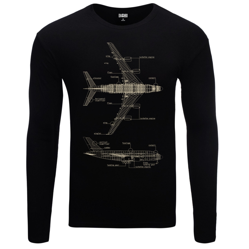 Koszulka z grafiką przedstawiającą legendarny samolot w schematycznym rysunku – doskonała dla pasjonatów lotnictwa i techniki. Na froncie znajduje się szczegółowy rysunek samolotu, na którym wyróżniono najważniejsze elementy konstrukcyjne, takie jak skrzydła, silniki, układ sterowania i inne. To połączenie stylu technicznego i eleganckiego designu.
