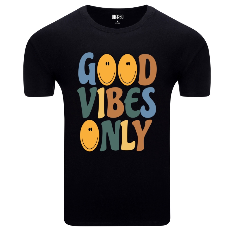 Koszulka z kolorowym napisem "GOOD VIBES ONLY" to prawdziwa dawka pozytywnej energii! Ręcznie rysowany, radosny font w pastelowych odcieniach błękitu, brązu, zieleni i żółci, uzupełniony o uśmiechnięte buźki, tworzy lekki i optymistyczny klimat. Idealna propozycja dla osób, które chcą dzielić się dobrą aurą i luzem na co dzień.