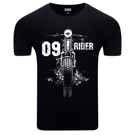 Ta czarna koszulka z motywem motocyklowym to esencja stylu i pasji dla każdego miłośnika dwóch kółek. Centralny nadruk przedstawia frontowy widok klasycznego motocykla, uchwycony w dynamicznej, czarno-białej grafice. Detale, takie jak reflektor, kierownica i przednie koło, są oddane z niezwykłą precyzją, co podkreśla autentyczny charakter designu. Dodatkowo, napis "09 RIDER" umieszczony po obu stronach motocykla, dodaje koszulce unikalnego, rajdowego charakteru.