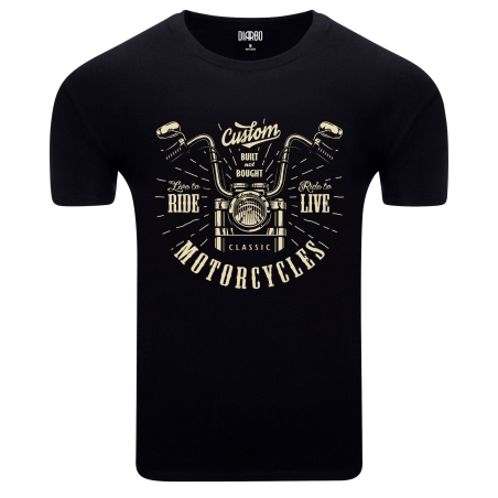 Ta koszulka to prawdziwa gratka dla miłośników klasycznych motocykli. Na przodzie koszulki znajduje się szczegółowy, graficzny nadruk przedstawiający kierownicę motocykla z reflektorem w centralnym punkcie. Nadruk zawiera również motywacyjne hasła "Live to Ride" i "Ride to Live", które oddają ducha motocyklowej pasji. Całość uzupełnia napis "Custom Built not Bought", podkreślający indywidualny charakter motocyklistów.