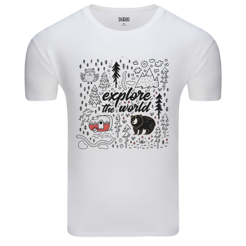 Koszulka „Explore the World” w kolorze kremowym to lekka i radosna zachęta do odkrywania świata oczami podróżnika. Pełna bajkowych ilustracji lasu, sowy, niedźwiedzia, przyczepy kempingowej i gór, oddaje ducha przygody i wolności, jaki niesie ze sobą podróżowanie w naturze. Styl graficzny przypomina rysunki z dziecięcej mapy skarbów – zabawny, urokliwy i pełen optymizmu.