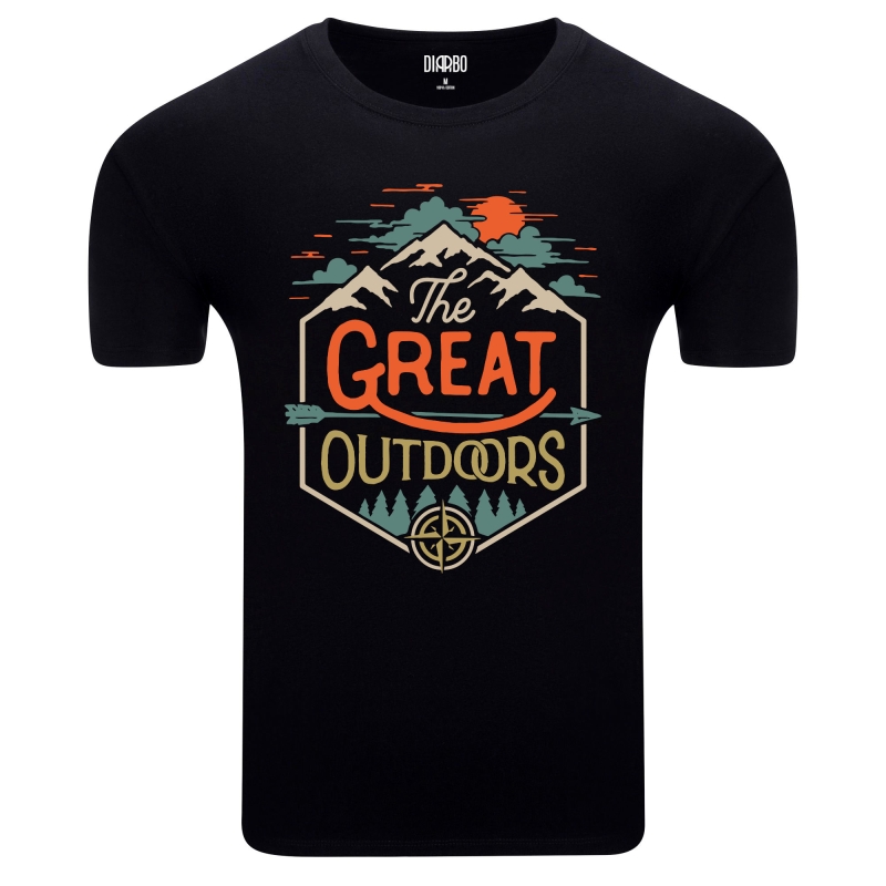koszulka z kolorowym nadrukiem w stylu vintage przedstawiającym górski krajobraz z napisem „The GREAT OUTDOORS” wpisanym w ozdobną ramkę, przywołuje ducha przygody i odkrywania natury. Grafika zawiera motywy gór, lasów, strzały i kompasu, a ciepła paleta barw w odcieniach pomarańczy, zieleni i błękitu na tle zachodzącego słońca dodaje jej nostalgicznego uroku.