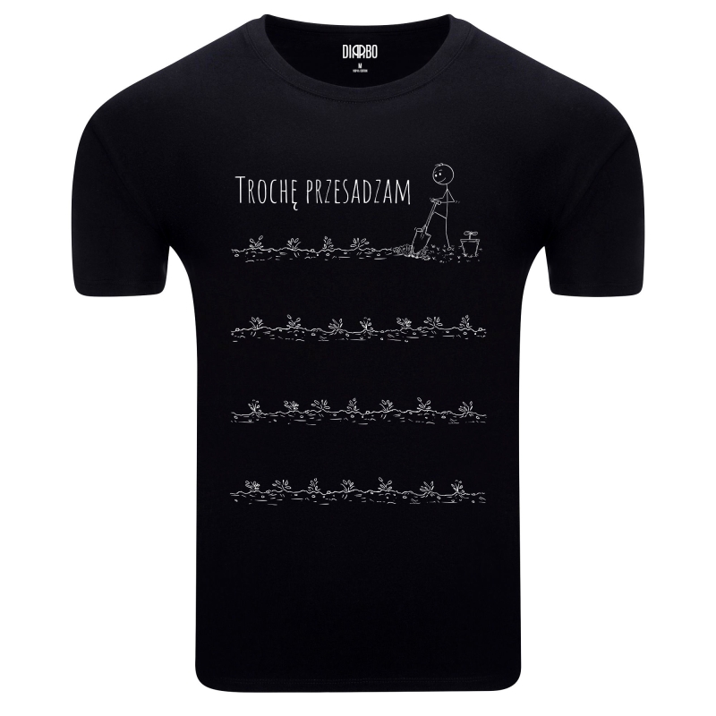 Koszulka „Trochę przesadzam” to zabawna propozycja dla każdego, kto z przymrużeniem oka podchodzi do ogrodnictwa i... dosłownie do wszystkiego innego! Minimalistyczna grafika przedstawia ludzika MrD z łopatą, przesadzającego małe roślinki w czterech rzędach. Humorystyczny rysunek i napis idealnie oddają sytuację, gdy ktoś lubi robić coś z nadmierną gorliwością lub po prostu ma do siebie dystans. To świetny wybór na prezent dla osoby z poczuciem humoru, miłośnika roślin lub kogoś, kto lubi żartobliwe akcenty w swoim ubiorze.