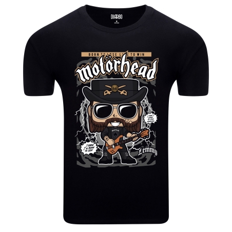 Ta koszulka to prawdziwa gratka dla fanów ikony rock'n'rolla i heavy metalu, Lemmy'ego Kilmistera z zespołu Motörhead. Prezentuje unikalny design z wizerunkiem Lemmy'ego w kreskówkowym stylu, z charakterystycznym kapeluszem, okularami przeciwsłonecznymi i gitarą basową. Tło grafiki utrzymane jest w mrocznej tonacji z motywem błyskawic, co podkreśla moc i energię muzyki Motörhead. To idealny wybór dla miłośników ostrych brzmień i legendarnych postaci rocka, którzy cenią sobie styl i jakość.