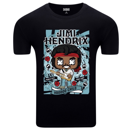 Ta koszulka to prawdziwa gratka dla fanów legendarnego gitarzysty i wokalisty, Jimmiego Hendrixa. Prezentuje unikalny design z wizerunkiem artysty w kreskówkowym stylu, z charakterystyczną opaską na głowie i gitarą. Otaczają go elementy nawiązujące do jego twórczości, takie jak "Purple Haze", "Foxy Lady" i "Voodoo Child", a także róże i czaszki symbolizujące rock'n'rollowy styl. Całość utrzymana jest w ciemnej tonacji z akcentami błękitu i czerwieni, co nadaje koszulce wyrazisty i artystyczny wygląd. To idealny wybór dla miłośników bluesa i rocka, którzy cenią sobie styl i jakość.