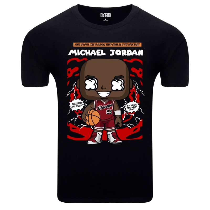 Ta koszulka to prawdziwa gratka dla fanów legendy koszykówki jaką jest Michael Jordan. Prezentuje unikalny design z wizerunkiem Jordana w kreskówkowym stylu, w klasycznym stroju Chicago Bulls z numerem 23, trzymającego piłkę do koszykówki. Tło grafiki utrzymane jest w dynamicznej, czerwono-czarnej tonacji z motywem piorunów, co podkreśla energię i dominację Jordana na boisku. To idealny wybór dla miłośników sportu i ikon popkultury, którzy cenią sobie styl i jakość.