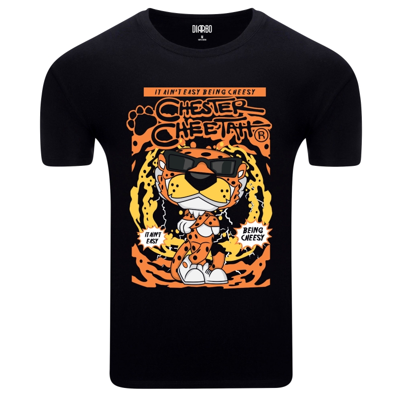 Ta koszulka to prawdziwa gratka dla fanów kultowej maskotki, Cheestera Cheetaha. Prezentuje unikalny design z wizerunkiem Cheestera w kreskówkowym stylu, z charakterystycznymi okularami przeciwsłonecznymi i hasłem "It ain't easy being cheesy". Całość utrzymana jest w czarno-pomarańczowej tonacji, z dynamicznym tłem nawiązującym do ognistego smaku Cheetos. To idealny wybór dla miłośników popkultury i retro-reklam, którzy cenią sobie styl i jakość.