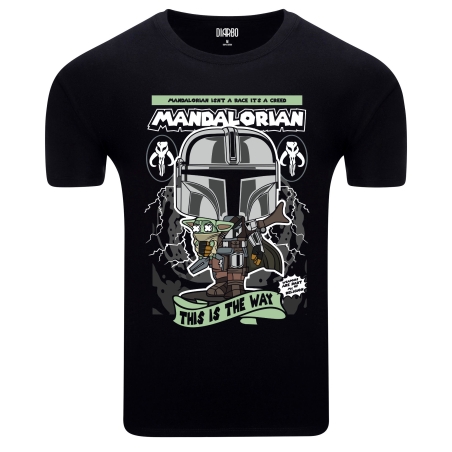 Ta koszulka to prawdziwa gratka dla fanów uniwersum Gwiezdnych Wojen, a zwłaszcza popularnego serialu "The Mandalorian". Prezentuje unikalny design z wizerunkiem tytułowego Mandalorianina i uroczego Grogu (Baby Yoda), w otoczeniu kultowych symboli takich jak hełm Mandaloriana i hasło "This is the Way". Całość utrzymana jest w ciemnej tonacji z akcentami zieleni i bieli, co nadaje koszulce nowoczesny i wyrazisty wygląd. To idealny wybór dla miłośników science fiction i galaktycznych przygód, którzy cenią sobie styl i jakość.