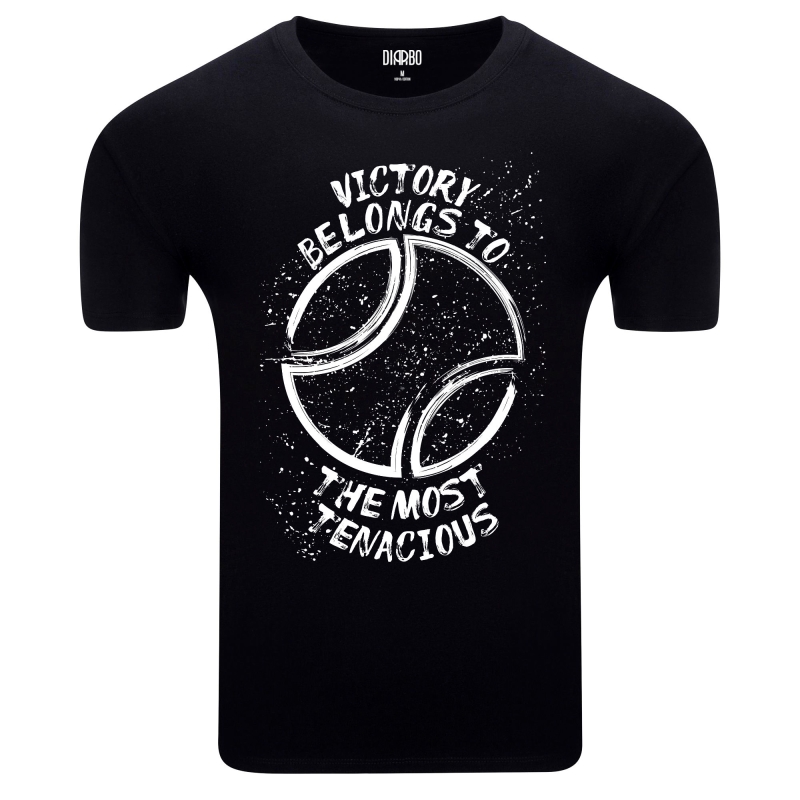 Ta koszulka to esencja sportowego ducha i determinacji. Prezentuje unikalny design z motywującym cytatem "VICTORY BELONGS TO THE MOST TENACIOUS" (Zwycięstwo należy do najbardziej wytrwałych), którego użył francuski lotnik Roland Garros. Napis otoczony jest stylizowaną piłką tenisową, wszystko w dynamicznej, grunge'owej estetyce. To idealny wybór dla sportowców i osób, które cenią sobie wytrwałość, siłę charakteru i dążenie do celu.