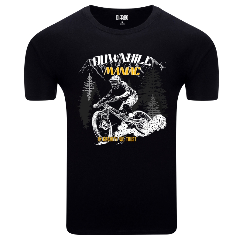 Ta koszulka to prawdziwa gratka dla pasjonatów górskich zjazdów i grawitacyjnych wyzwań. Prezentuje unikalny design z dynamiczną grafiką przedstawiającą rowerzystę MTB w otoczeniu gór i lasów, z wyraźnym napisem "DOWNHILL MANIAC" oraz "IN GRAVITY WE TRUST". To idealny wybór dla wszystkich, którzy żyją zjazdem, cenią sobie styl i jakość, a także chcą wyrazić swoją bezgraniczną wiarę w siłę grawitacji.