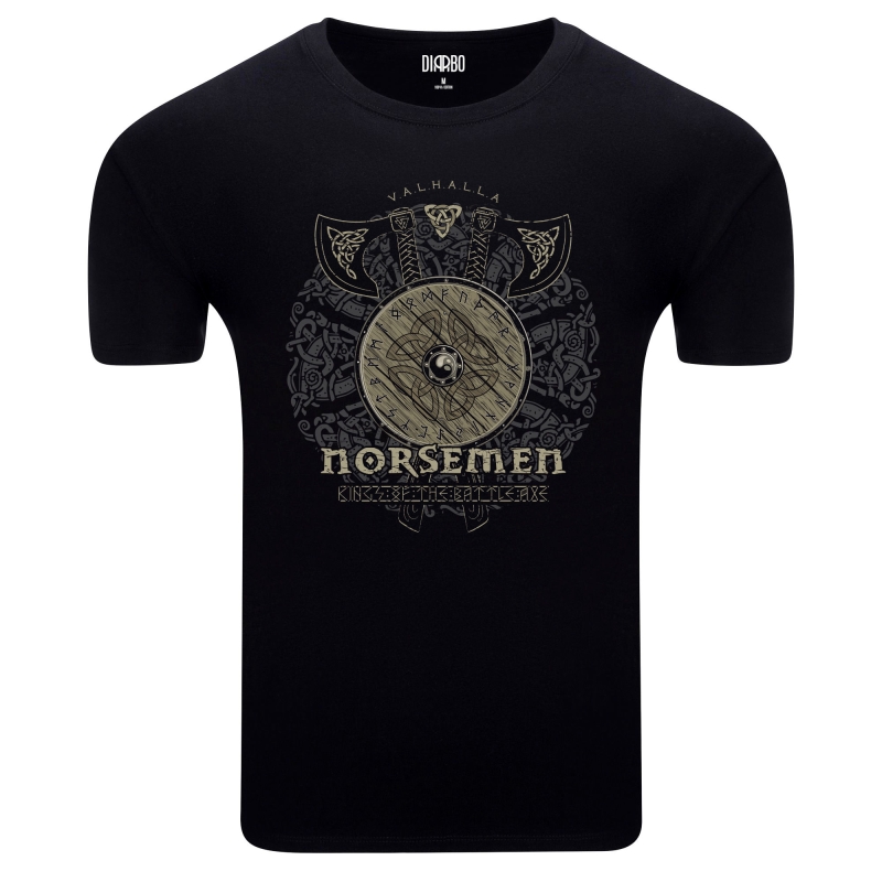 Odkryj ducha walecznych wikingów z tą koszulką, która prezentuje potężne topory nordyckie skrzyżowane za tarczą wikinga, wszystko to na tle misternych plecionek celtyckich. Motywy te symbolizują siłę, ochronę i gotowość do walki, a jednocześnie nawiązują do bogatej kultury nordyckiej. Na górze koszulki widnieje napis "VALHALLA", a pod głównym motywem "NORSEMEN" oraz runiczne inskrypcje, które podkreślają autentyczność wzoru. To idealny wybór dla miłośników historii, mitologii nordyckiej i tych, którzy cenią sobie symbolikę męstwa i niezłomności.