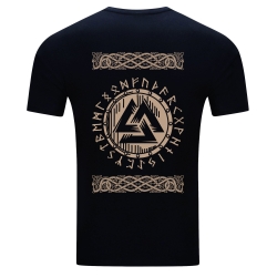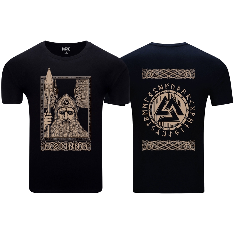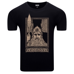 Prezentujemy dwustronną koszulkę, która jest prawdziwą gratką dla miłośników mitologii nordyckiej! Na froncie dumnie widnieje wizerunek Odyna, Wszechojca, z jego legendarną włócznią Gungnir, otoczonego ramką z nordyckimi wzorami i napisem "ODINN". To potężny symbol mądrości, wojny i poezji. Rewers koszulki zdobi symbol Valknut – węzeł poległych, oraz runiczne inskrypcje, co nadaje całości głęboki, symboliczny wymiar i podkreśla powiązanie z pradawnymi wierzeniami. To idealny wybór dla pasjonatów historii wikingów, symboliki nordyckiej oraz tych, którzy cenią sobie wyraziste i znaczące wzory.