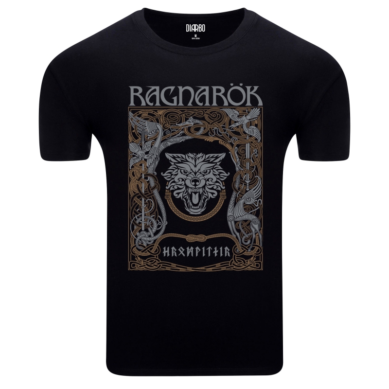 Prezentujemy koszulkę dla miłośników mrocznej i epickiej mitologii nordyckiej! Centralnym punktem designu jest groźny wizerunek wilka, prawdopodobnie nawiązujący do Fenrira, kluczowej postaci w przepowiedni o Ragnaroku. Wzór otoczony jest bogatymi, stylizowanymi plecionkami celtyckimi oraz motywami ptaków, co nadaje mu starożytny i mistyczny charakter. Na górze koszulki widnieje napis "RAGNARÖK", a pod spodem runiczna inskrypcja "HRXMPITHIR", co dodatkowo podkreśla nordyckie korzenie wzoru. To idealny wybór dla pasjonatów nordyckich legend, symboliki zwierzęcej oraz tych, którzy cenią sobie mroczną i potężną estetykę.