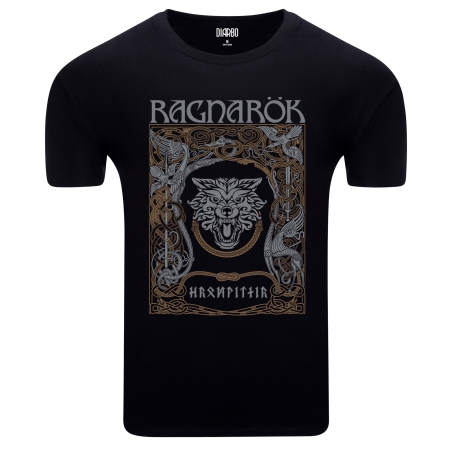 Prezentujemy koszulkę dla miłośników mrocznej i epickiej mitologii nordyckiej! Centralnym punktem designu jest groźny wizerunek wilka, nawiązujący do Fenrira, kluczowej postaci w przepowiedni o Ragnaroku. Wzór otoczony jest bogatymi, stylizowanymi plecionkami celtyckimi oraz motywami ptaków, co nadaje mu starożytny i mistyczny charakter. Na górze koszulki widnieje napis "RAGNARÖK", a pod spodem runiczna inskrypcja "HRXMPITHIR", co dodatkowo podkreśla nordyckie korzenie wzoru. To idealny wybór dla pasjonatów nordyckich legend, symboliki zwierzęcej oraz tych, którzy cenią sobie mroczną i potężną estetykę.
