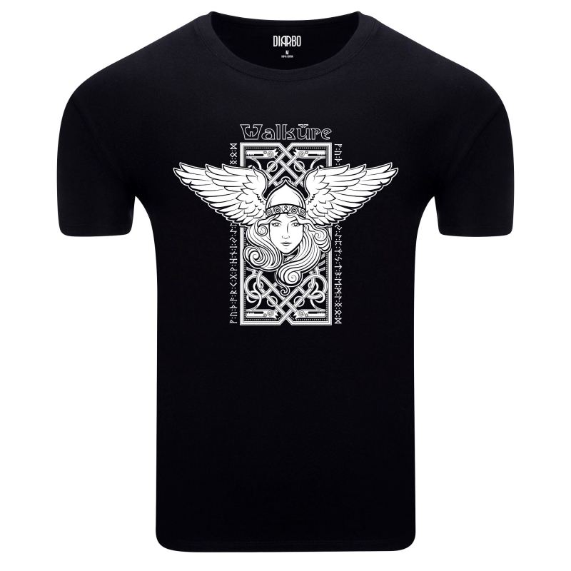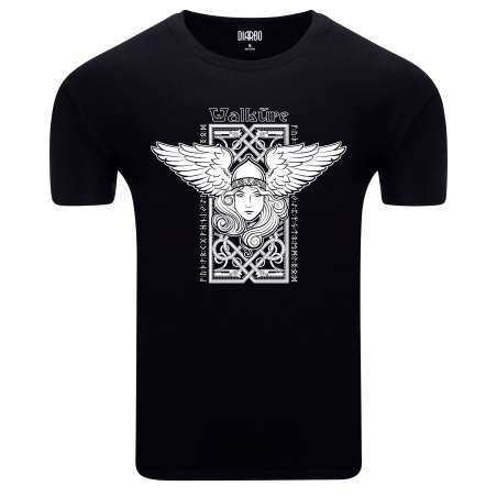 Ta koszulka to hołd dla potężnych Walkirii, przedstawiająca ich eteryczny, a zarazem wojowniczy wizerunek. Centralnym punktem jest postać Walkirii w hełmie z rozłożystymi skrzydłami, otoczona misternymi nordyckimi plecionkami i runicznymi inskrypcjami. Wzór emanuje siłą, pięknem i tajemniczością, odzwierciedlając rolę Walkirii jako przewodniczek dusz poległych wojowników do Walhalli. Na górze koszulki widnieje napis "Walküre", co jest niemiecką formą nazwy tych mitycznych postaci. To idealny wybór dla miłośników mitologii nordyckiej, symboliki kobiecej siły oraz tych, którzy cenią sobie motywy związane z honorem i przeznaczeniem.
