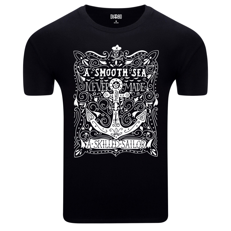 Ta koszulka to hołd dla wytrwałości i siły charakteru, idealna dla tych, którzy wiedzą, że prawdziwe umiejętności kształtują się w trudnych chwilach! Centralny motyw to misternie zdobiona kotwica, symbol stabilności i nadziei, otoczona inspirującym cytatem: "A SMOOTH SEA NEVER MADE A SKILLED SAILOR". Cała grafika jest bogata w detale, takie jak fale, gwiazdy i ozdobne ornamenty, co nadaje wzorowi klasyczny, morski charakter. To idealny wybór dla miłośników żeglarstwa, poszukiwaczy przygód oraz wszystkich, którzy cenią sobie mądrość życiową i symbolikę morza.