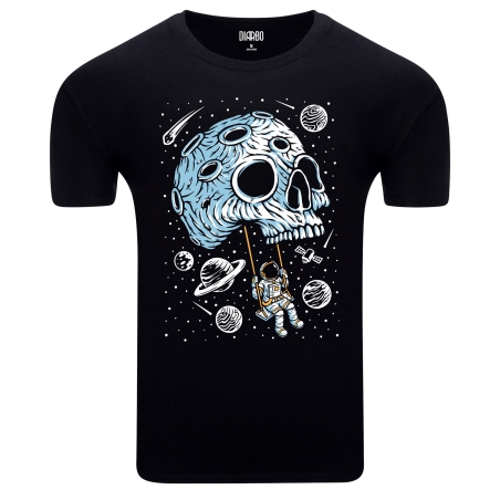 Ta koszulka to fantastyczna propozycja dla miłośników kosmosu, abstrakcji i unikalnego stylu. Centralnym punktem designu jest kreatywne połączenie czaszki z planetą, z widocznymi kraterami i satelitami. Dodatkowo, na sznurach niczym na huśtawce, wisi astronauta, otoczony planetami i gwiazdami. To wizja, która przenosi nas w międzygalaktyczną przestrzeń, łącząc tajemnicę z odrobiną surrealizmu.