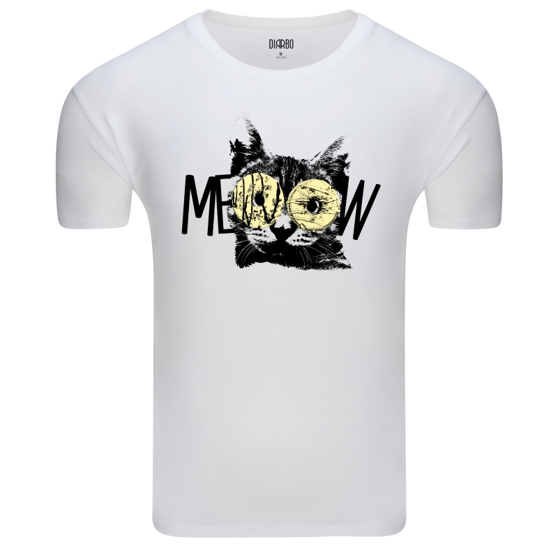 Ta koszulka to idealna propozycja dla wszystkich, którzy cenią sobie koci urok, humor i odrobinę tajemnicy! Centralnym punktem designu jest intrygująca grafika: wizerunek kota o intensywnych, żółtych oczach przypominających pączki, a pod spodem wyróżnia się napis "MEOW". Całość, utrzymana w stonowanej kolorystyce, tworzy minimalistyczny, a jednocześnie pełen charakteru wzór. To must-have dla każdego miłośnika kotów, który chce wyrazić swoją osobowość w modny i nieco figlarny sposób.