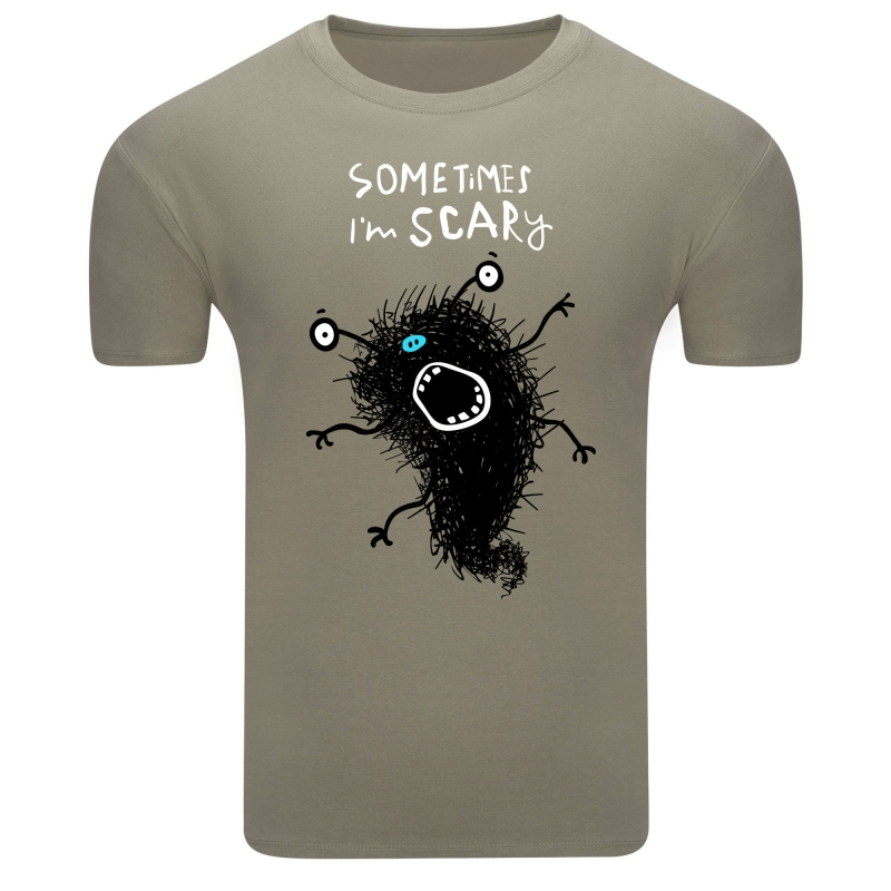 Ta koszulka to idealna propozycja dla tych, którzy cenią sobie samoironię, komiksowy humor i wyrazisty styl! Centralnym punktem designu jest zabawny, rozczochrany, włochaty stwór w trakcie... krzyku lub ziewania, któremu towarzyszy napis "SOMETIMES I'M SCARY" (Czasami jestem straszny). Ten wzór, osadzony na ciepłym, świetnie wyraża te dni, kiedy czujemy się mniej niż doskonale, ale robimy to z przymrużeniem oka!
