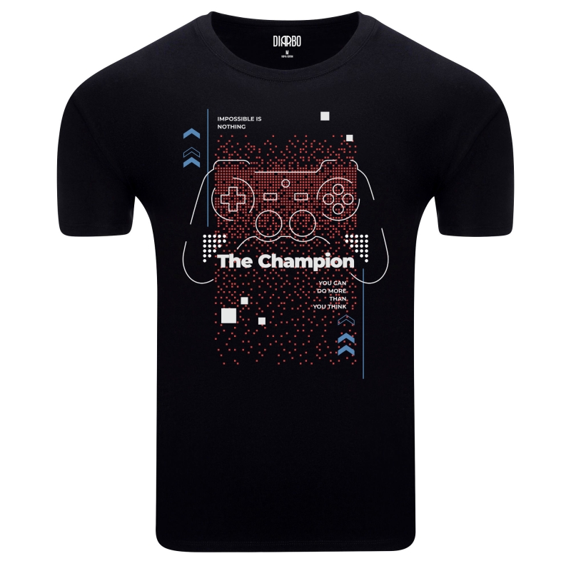 Ta koszulka to idealna propozycja dla tych, którzy cenią sobie świat gamingu, determinację oraz nowoczesną, cyfrową estetykę! Centralnym punktem designu jest dynamiczna grafika zarys kontrolera do gier w otoczeniu geometrycznych i pikselowych elementów. Hasło "The Champion" wraz z motywacyjnymi cytatami ("IMPOSSIBLE IS NOTHING", "YOU CAN DO MORE THAN YOU THINK") to manifest dla każdego gracza i entuzjasty e-sportu, który dąży do mistrzostwa.