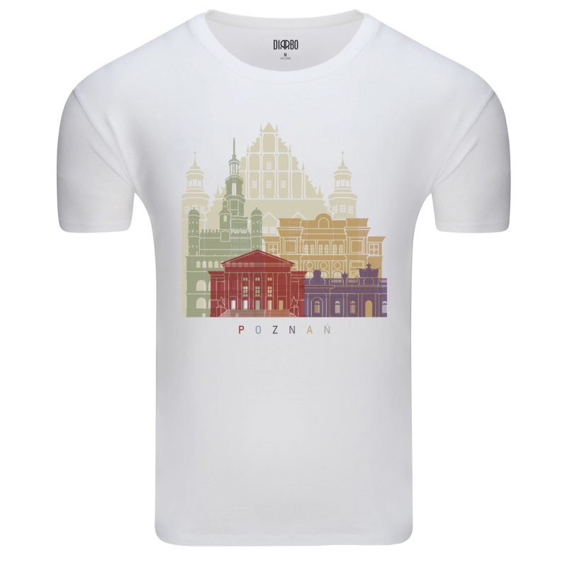 Ta biała koszulka to eleganckie nawiązanie do historii i architektury Wielkopolski. Centralnym punktem designu jest stylizowana, minimalistyczna panorama Poznania, z wyraźnie zaznaczonymi kluczowymi zabytkami, takimi jak Ratusz. Obrysy budynków wypełnione są subtelnymi, pastelowymi kolorami (odcienie zieleni, fioletu i czerwieni), co nadaje grafice lekkości i nowoczesności. Całość dopełnia nazwa miasta "POZNAŃ" umieszczona u dołu. To idealny wybór dla każdego, kto ceni sobie polską tradycję i piękno historycznych rynków.