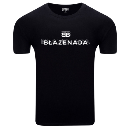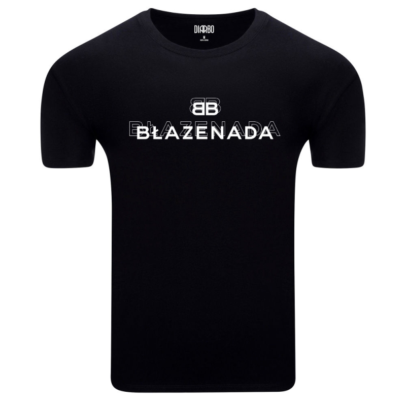 Ta koszulka to propozycja dla tych, którzy cenią sobie minimalistyczny design połączony z ironicznym przekazem. Centralnym punktem jest napis "BŁAZENADA" wykonany nowoczesną, pogrubioną czcionką. Tekst ma unikalny, subtelny efekt glitch/warstwowy, co dodaje mu dynamiki i głębi. Nad hasłem znajduje się geometryczny, lustrzany symbol. To minimalistyczne, biało-czarne połączenie stawia na silny, choć cyniczny, miejski statement.