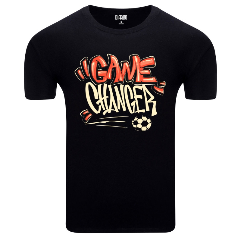 Ta koszulka to idealna propozycja dla fanów piłki nożnej i miejskiego stylu. Centralnym punktem designu jest dynamiczny napis "GAME CHANGER", wykonany w efektownym, graffiti stylu z komiksowym wykończeniem. Górna część napisu wyróżnia się czerwono-pomarańczową kolorystyką, podczas gdy dolna utrzymana jest w jasnym, kremowym odcieniu. Całość uzupełnia grafika piłki nożnej w ruchu umieszczona poniżej, co nadaje koszulce sportowego ducha i energii.