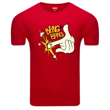 Ta koszulka to propozycja dla fanów komiksowego stylu i odrobiny humoru z przymrużeniem oka. Centralnym punktem designu jest rysunkowa, biała dłoń w rękawiczce ułożona w gest pistoletu, z której wydobywa się dynamiczny, żółty wybuch. Całość uzupełnia wyrazisty, czerwono-żółty napis "BANG BANG", nawiązujący do estetyki pop-artu. To zabawne połączenie nadaje koszulce luźny, młodzieżowy charakter, który z pewnością przyciągnie spojrzenia.