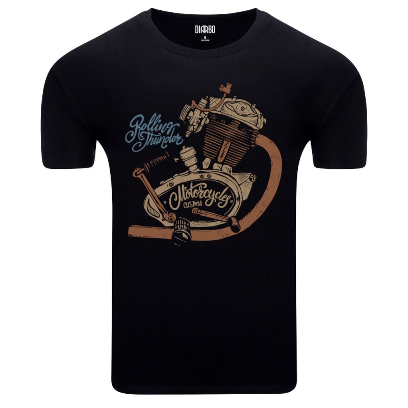 Ta koszulka to idealna propozycja dla miłośników klasycznej motoryzacji i surowego, garażowego stylu. Centralnym punktem designu jest szczegółowa, stylizowana na vintage grafika silnika motocyklowego, utrzymana w stonowanej, brązowo-miedzianej kolorystyce. Kompozycję dopełnia dynamiczny, błękitny napis "Rolling Thunder" wykonany ozdobną czcionką oraz emblemat "Motorcycles Custom". To artystyczne ujęcie mechaniki nadaje koszulce nostalgiczny i męski charakter, przywołujący na myśl kulturę starych warsztatów.