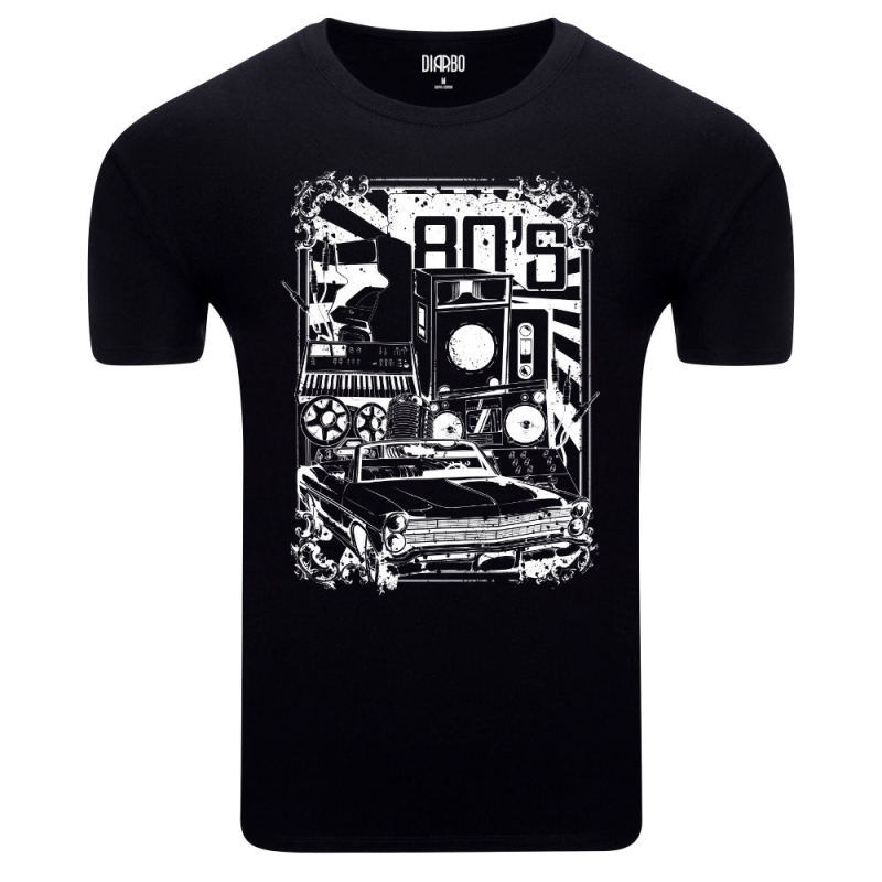 Ta koszulka to bogaty w detale, nostalgiczny hołd dla kultury lat 80. Centralny motyw to złożony, monochromatyczny kolaż, przedstawiający ikony tamtej dekady. Wyróżnia się klasyczny samochód kabriolet, ogromne głośniki (boombox), syntezator, kasety magnetofonowe oraz duży napis "80'S". Cała kompozycja jest oprawiona w postarzaną, grunge'ową ramę, co dodaje jej autentycznego, retro klimatu.