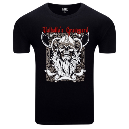 Ta koszulka to mroczna i szczegółowa propozycja dla fanów mitologii nordyckiej i estetyki heavy metalowej. Centralnym punktem designu jest stylizowana, wojownicza czaszka Wikinga w hełmie z rogami i z długą brodą. Za czaszką krzyżują się dwa topory bojowe. Grafika jest bogato zdobiona misternym, celtycko-nordyckim splotem. U góry widnieje czerwony, gotycki napis "Valhalla's Graveyard" (Cmentarz Valhalli).